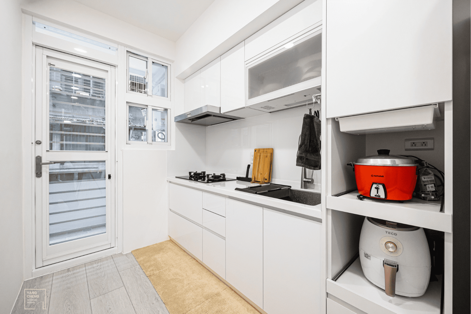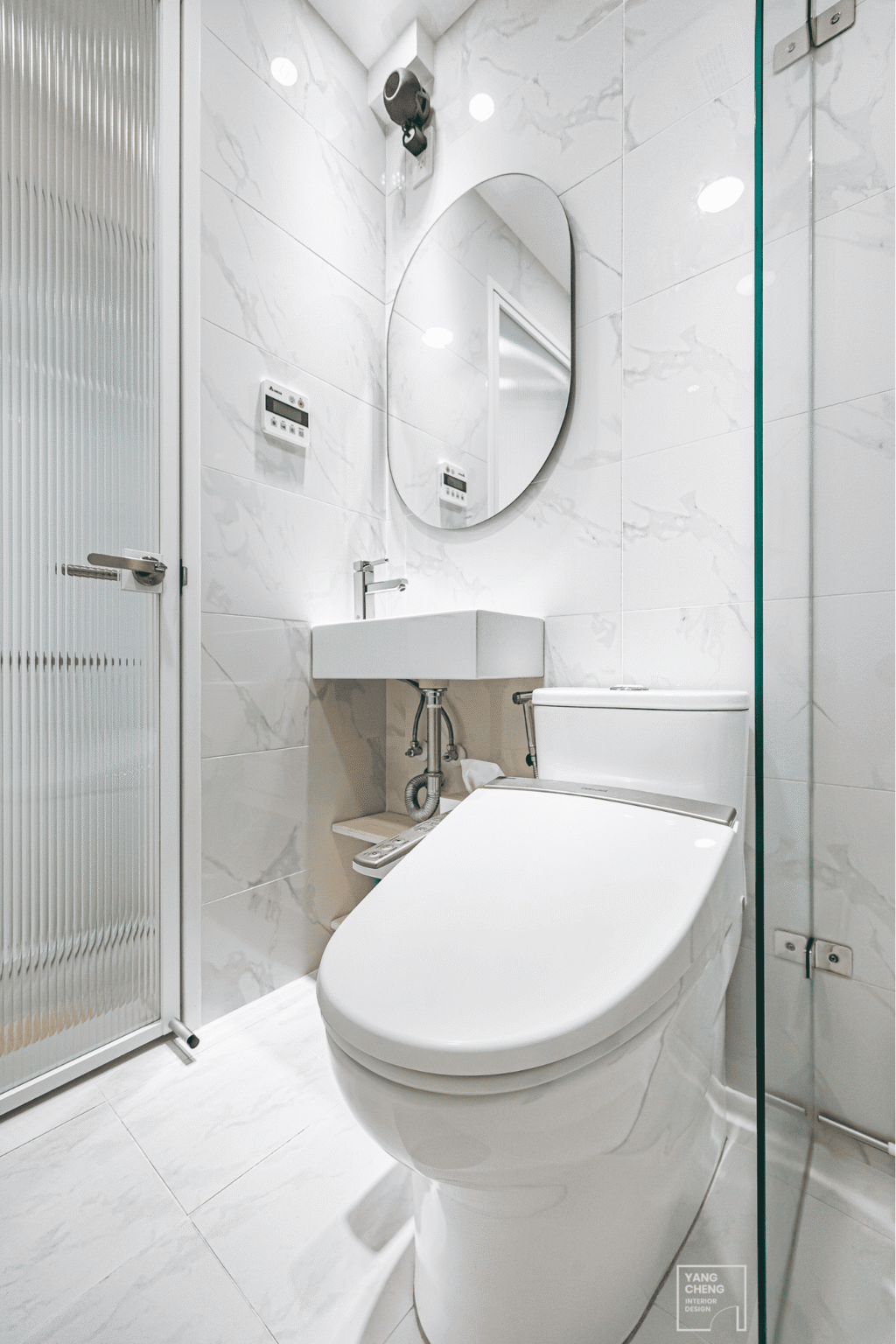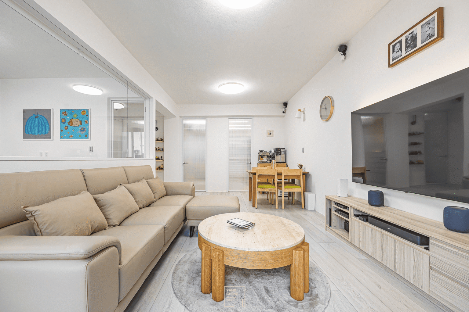 設計注重細節與材質的對話。大理石紋理與鐵件元素形成強烈對比,賦予空間俐落而不失溫度的視覺張力。牆面與地板的質感相互呼應,呈現理性與自然之間的微妙平衡。開放式的格局讓客廳與餐廳之間自然銜接,營造出空間的流動感,提升使用的靈活性與實用性。